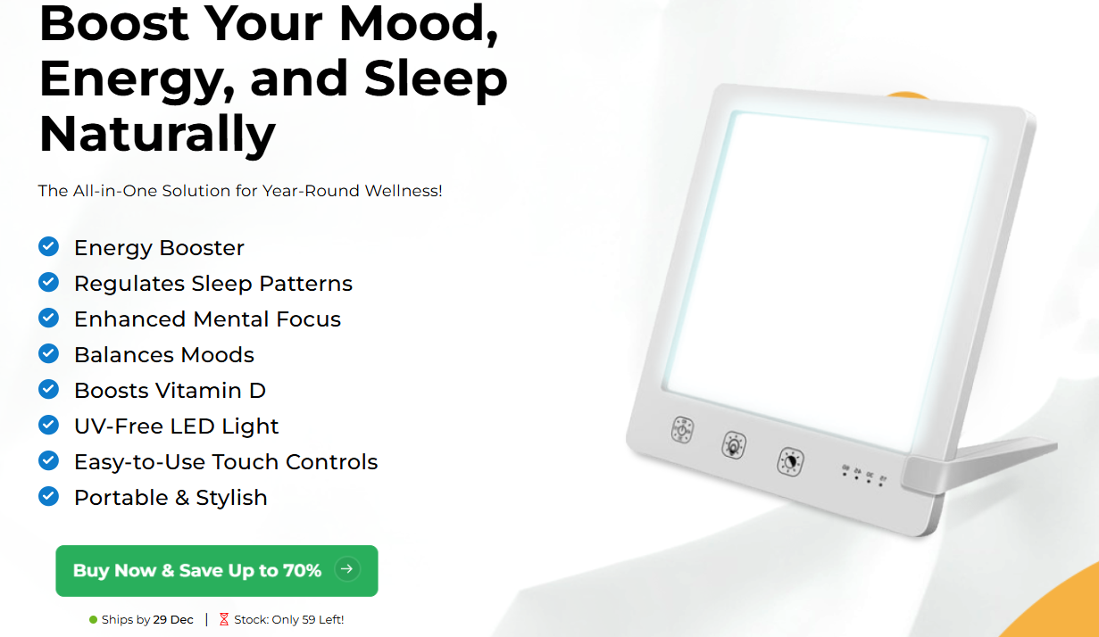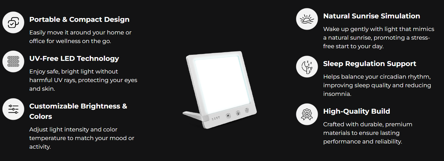 Users and product descriptions highlight several potential benefits mainly centered around wellness, mood, energy, and sleep. It’s important to note that while light therapy has been clinically studied (especially for Seasonal Affective Disorder), results vary by individual and the product is not a medical treatment.